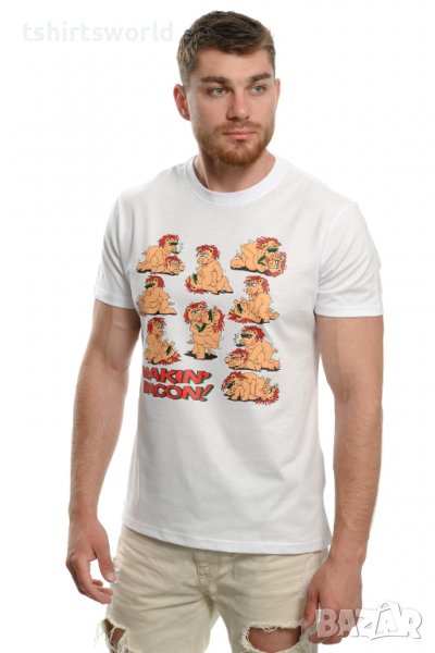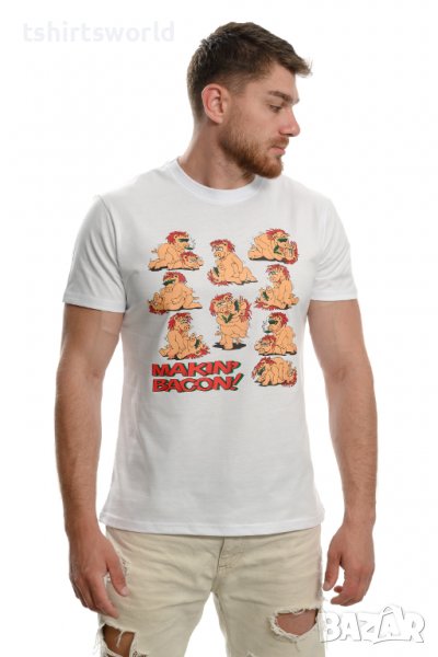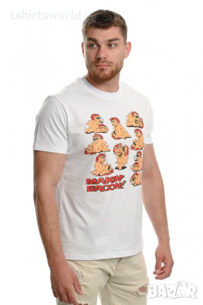 Страхотна нова забавна мъжка тениска в бял цвят с трансферен печат MAKIN' BACON с прасета. Тениската е изработена в България под марката PRINTEX от висококачествен 100% пениран памук на 170 гр./м², който запазва цялостта на материята и наситеността на цветовете. С удобна кройка, тениската е свободна и позволява максимален комфорт при носене. Професионално изработен висококачествен трансферен печат, устойчив на пране с години. Тениската може да се пере при температура до 40 градуса. Спокойно можем да гарантираме за качеството на изработката и ярките цветове на дизайна.