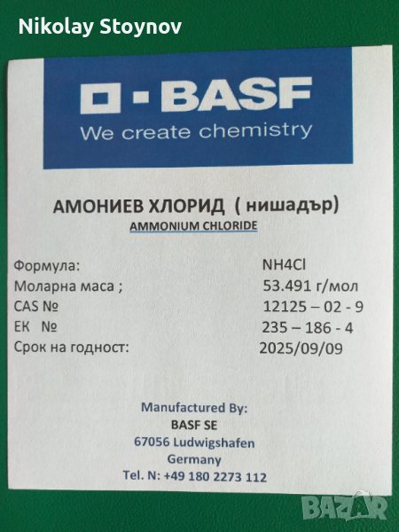 амониев хлорид с изключително високо качество и чистота, произведен от компанията немската компания BASF - най-големия химически концерн в света, който не се нуждае от реклама на произвежданите от него продукти!