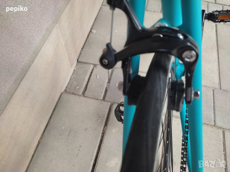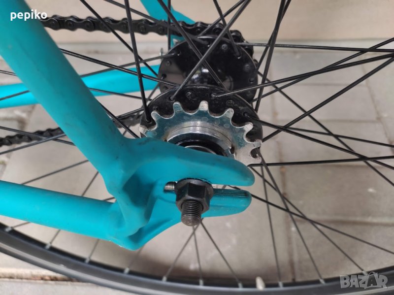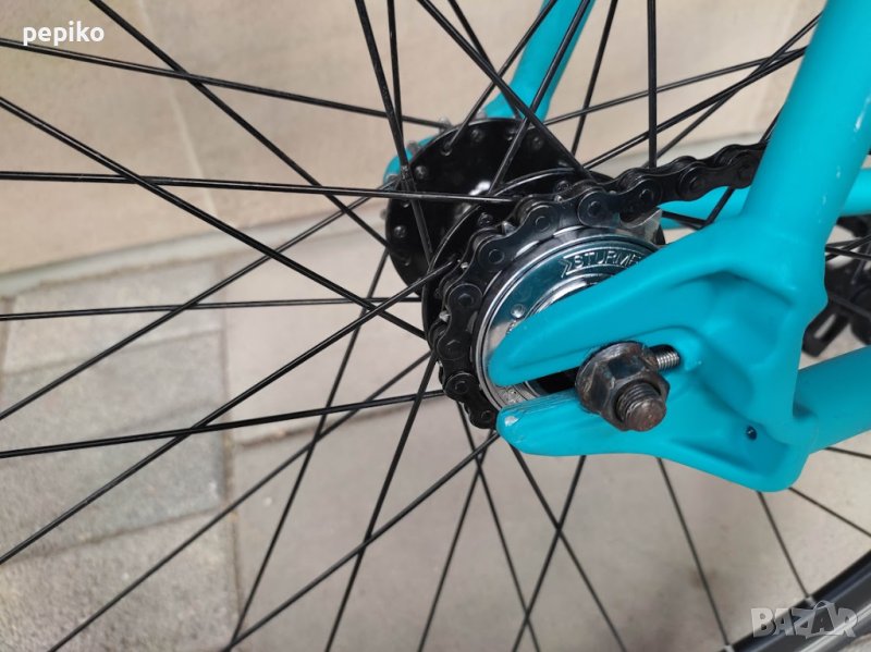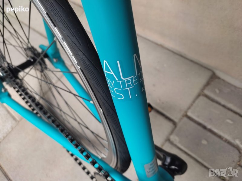 НОВ алуминиев сингъл велосипед TRETWERK ALMA 28 цола,супер лека алуминиева рамка от хидроформовани тръби 28 цола с една скорост,алуминиеви курбели със сменяема плоча,алуминиеви педали,средно движение касета,задни венци два броя от двете страни на каплата,единия със свободен ход,другия при завъртана на задната капла фиксиран,върти се заедно с педалите на пред и на зад,задна алуминиева главина ASSESS,предна алуминиева главина,предна и задна алуминиеви убрейк спирачки,спортна седалка на релси SELE ASSANO,алуминиево колче на седалката,алуминиева лапа и кормило,силиконови грипове,алуминиеви двойностенни усилени капли,емайлирани спици,гуми задна ШВАЛБЕ ЛУГАНО 700 х 23,предна КЕНДА 700 х 28с размер на рамката 57 х 57 см.тегло 9,6 кг.много добър.