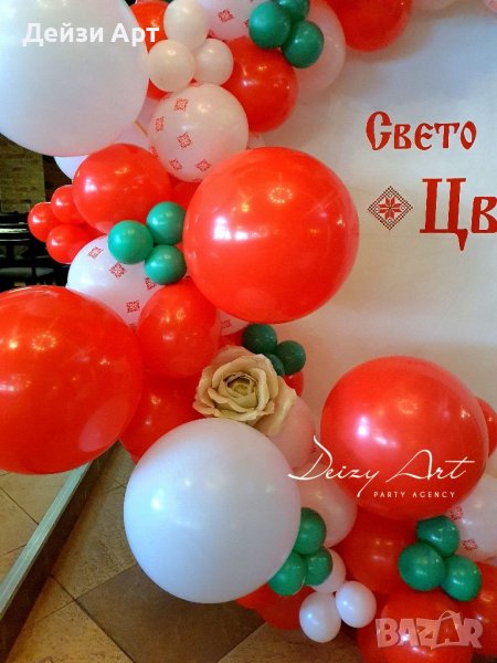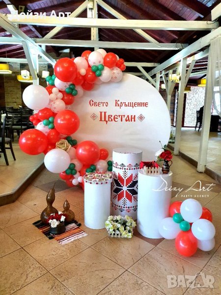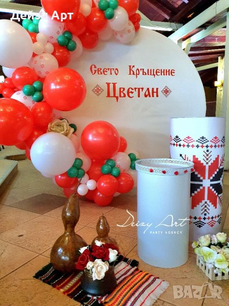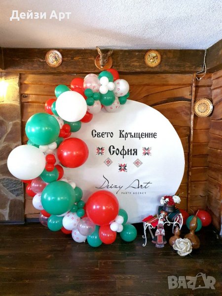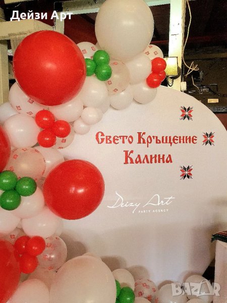 Украса под наем на тема българска шевица.Надпис в цвят по ваш избор,както и цветовете на балоните са по ваш избор.