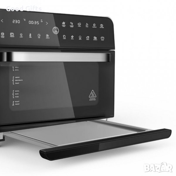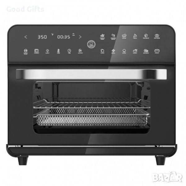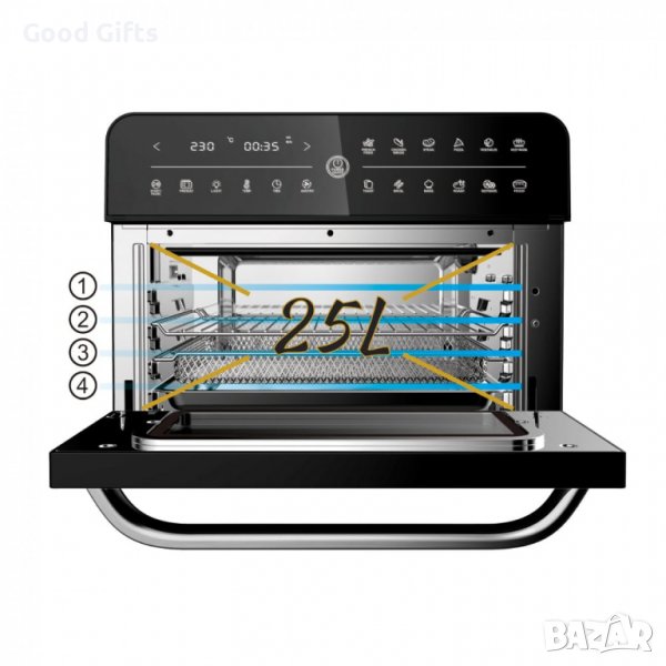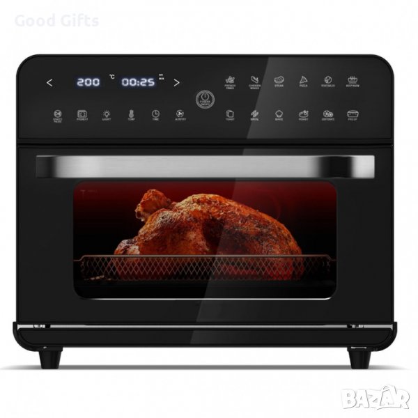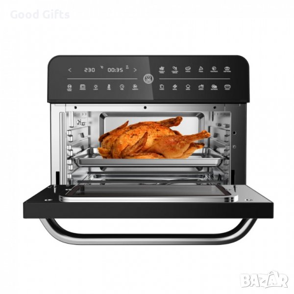Най-големият уред за пържене с горещ въздух от висок клас, предлагащ авангардна технология за циркулация на въздуха и топлината за действително покритие от 360 градуса на повърхността за готвене. 40% по-кратко време за готвене - постигнато чрез сложен иновативен дизайн на голям вентилатор и въздухозаборник, дефлектори за въздух с 2 изпъкнали корпуса и горни и долни нагревателни тръби. Използвайки изцяло новата технология 360° HOT AIR CIRCULATION, фурната с горещ въздух ще ти предложи по-вкусна и здравословна храна. Капацитет от 25 литра за ползване в семейна среда, подходящ за приготвяне на цяло пиле или пуйка за 30 минути, без нужда от шиш. В нея едновременно приготвяш около килограм пържени картофки или пилешки крилца.