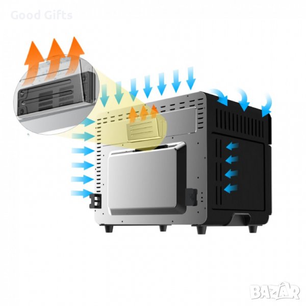Висококачествен издръжлив корпус от неръждаема стомана с входящи и изходящи отвори за въздух, които засмукват допълнителен хладен въздух и бързо отвеждат влагата, гарантирайки по-хрупкава и вкусна храна.