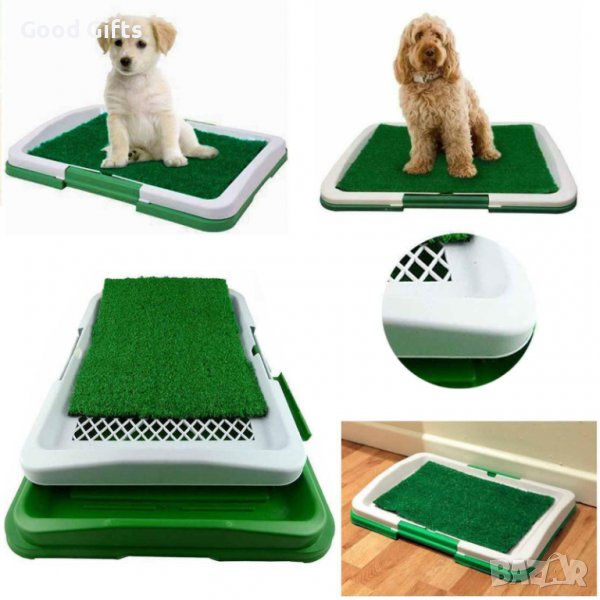 Puppy Potty Pad е нов вид съд за кучешка тоалетна с решетка и изкуствена трева, която наподобява реалните условия за изхождане.Размери 47х34х5 см.
