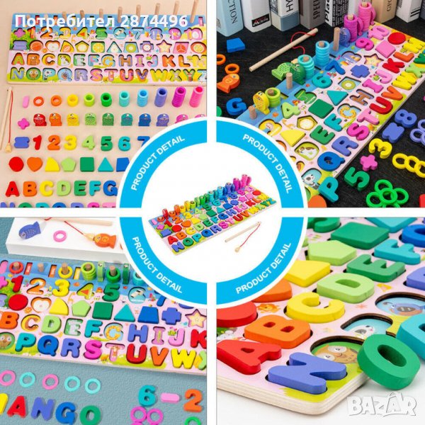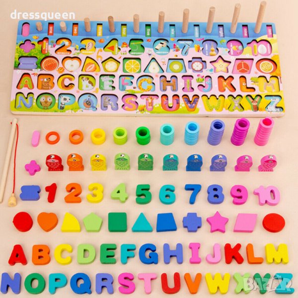 -12 различни дървени фигурки с цветни форми.