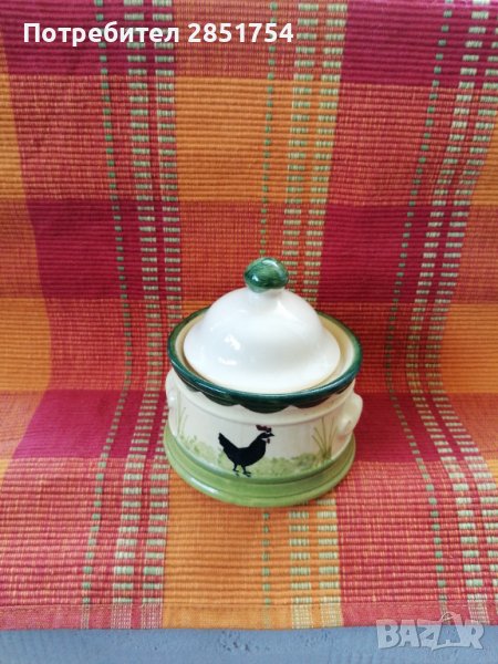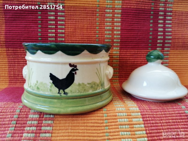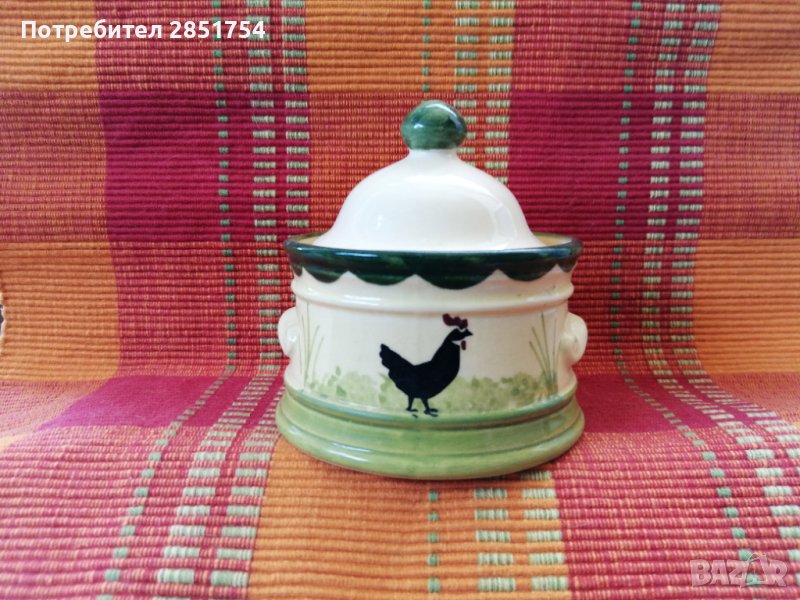 Колекционерска купичка с капаче за сметана от серията Петел и Кокошка на керамика ,, Зеллер ", не е използвана, съхранявана е във витрина,ръчно изработена и изрисувана, закупена от Германия. Височина без капаче - 6см, с капаче - 10см, диаметър на дъното-9,5см,диаметър под капачето-8.5см