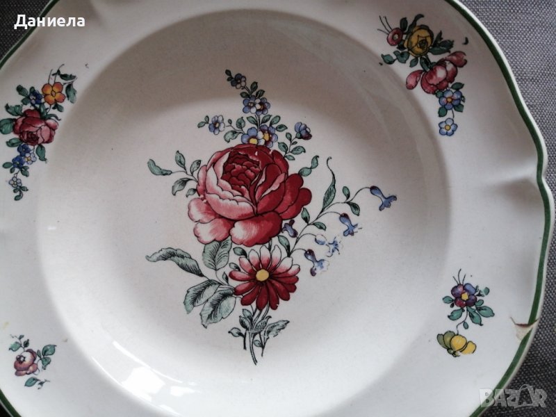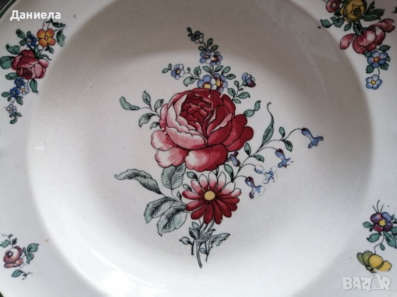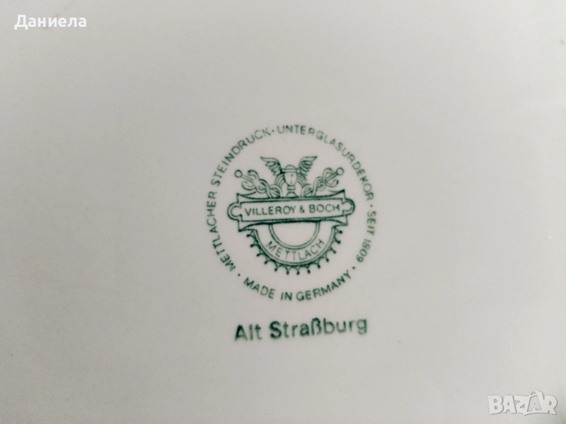 1. Много стара Villeroy & Boch чиния модел 1562 с печати. Произведена в Германия във фабриката в Mettlach Alt Strassburg. Този модел е излязъл от употреба, правен е между 1874 и 1909 г. Налична 1 брой с малко нарушение в края от лицевата старна. Цена 28€