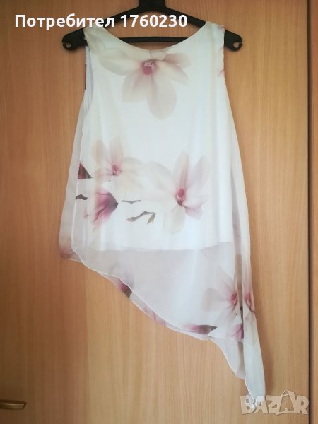 Асиметричнен дамски топ. Материята е шифон. С подплата от трико. Размер ХС. Цена 5 лв.