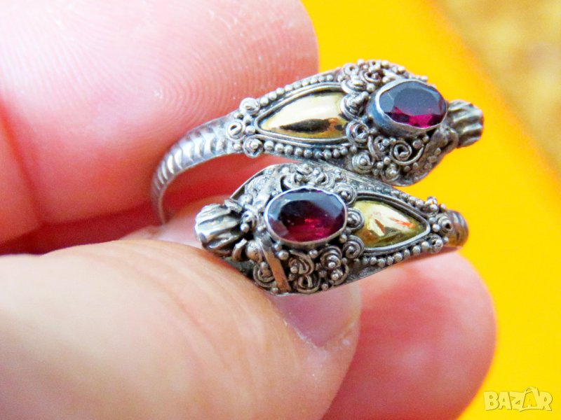 сребърен пръстен, стар османски сребърен пръстен с орнаменти, рубини и позлата, турски сребро