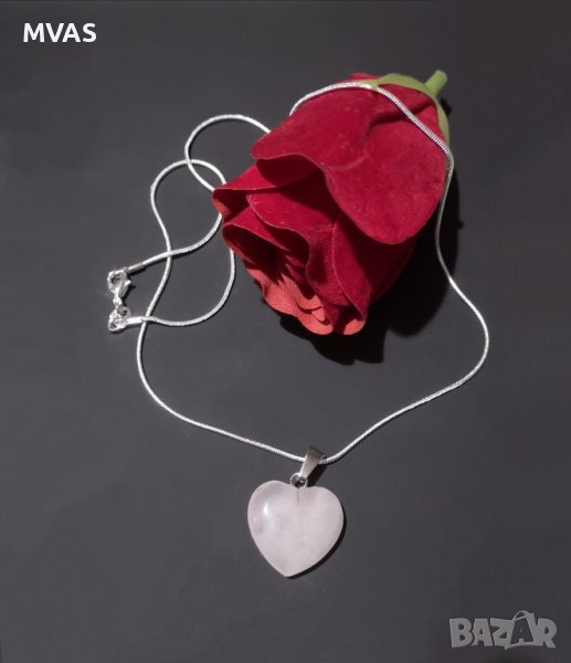 -романтично нежно колие - висулка форма сърце натурален светло розов кварц и посребрена верижка змийска плетка с покритие и блясък