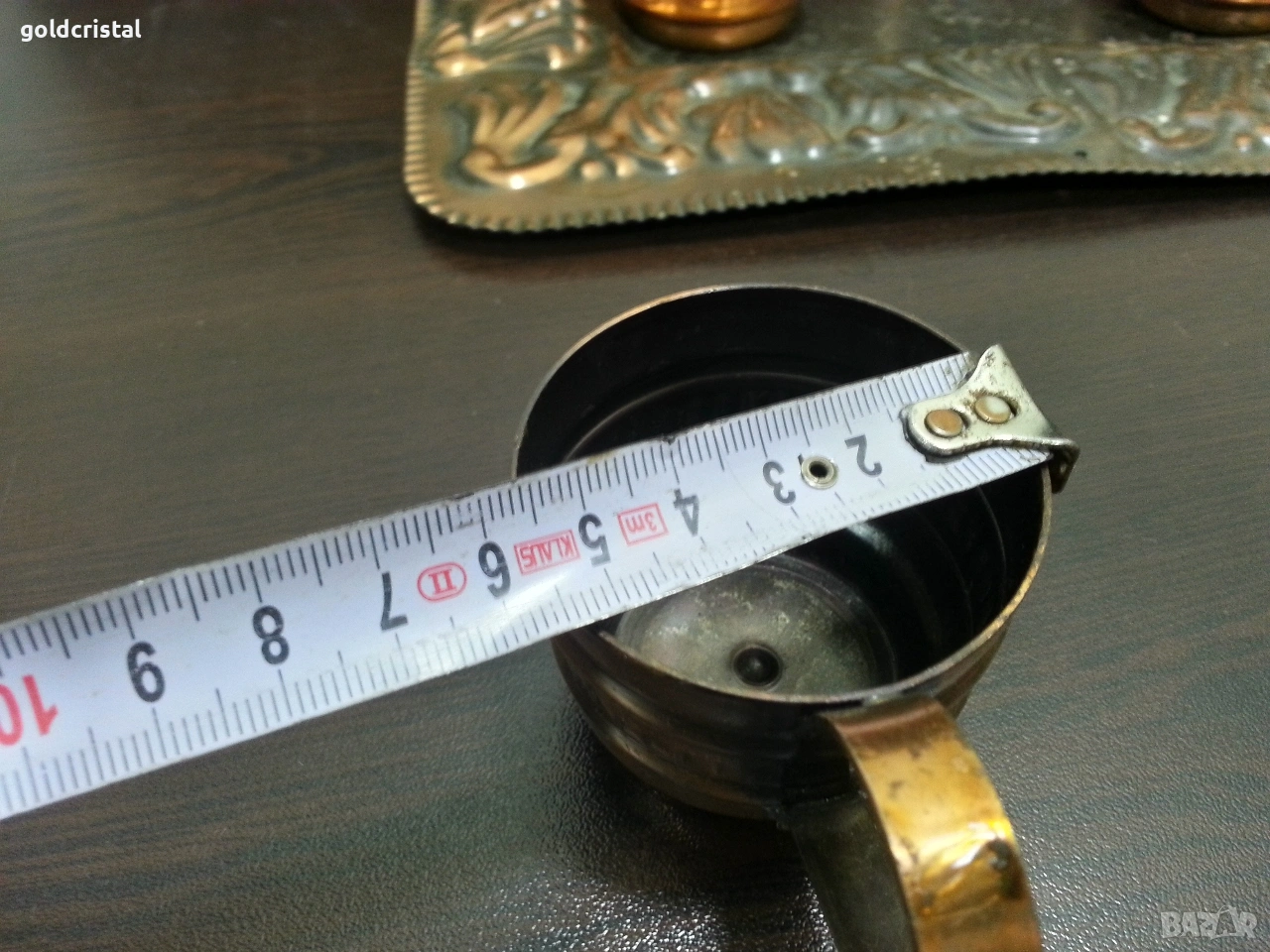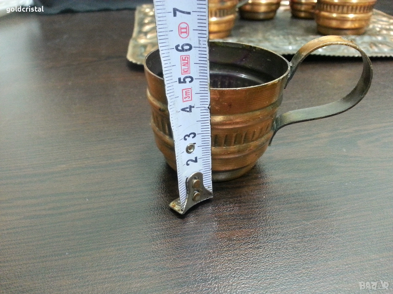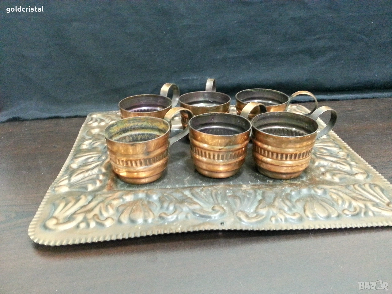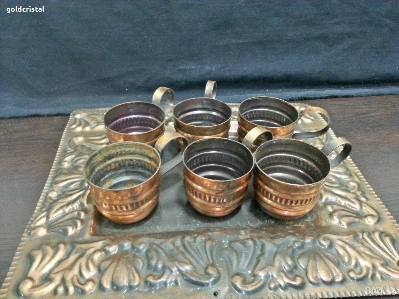 стари медни чашки с поднос сервиз комплект сет лот ретро арт декор винтидж колекция стари старинни антикварни предмети обзавеждане за дома и семейството подходящи за подарък за ценители и колекционери