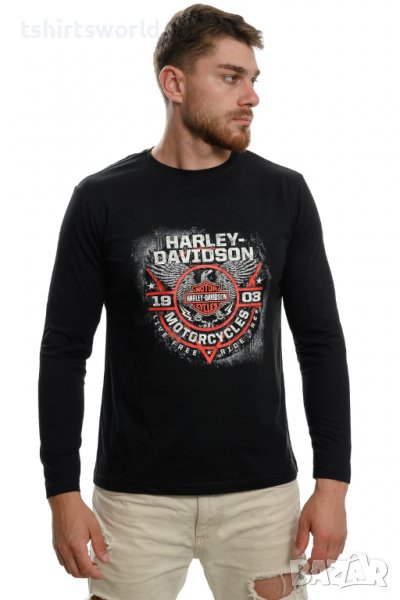 Страхотна нова черна мъжка блуза с дълъг ръкав с професионално изработен висококачествен дигитален печат Harley Davidson, мотори, устойчив на пране с години. Блузата е изработена в България под марката PRINTEX от висококачествен 100% пениран памук, който запазва цялостта на материята и наситеността на цветовете на черното трико дълго време. Може да се пере при температура до 40 градуса. Спокойно можем да гарантираме за качеството на изработката и ярките цветове на дизайна.
