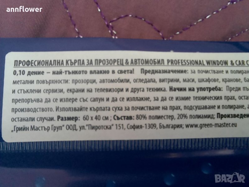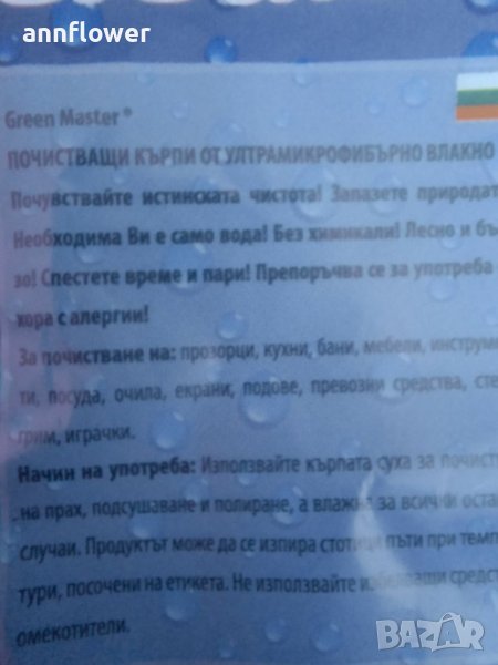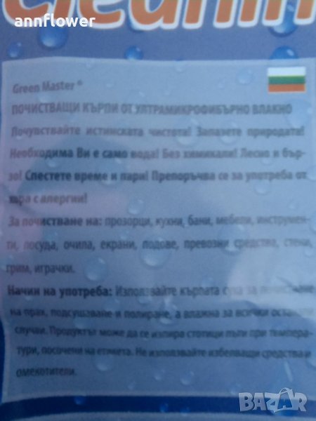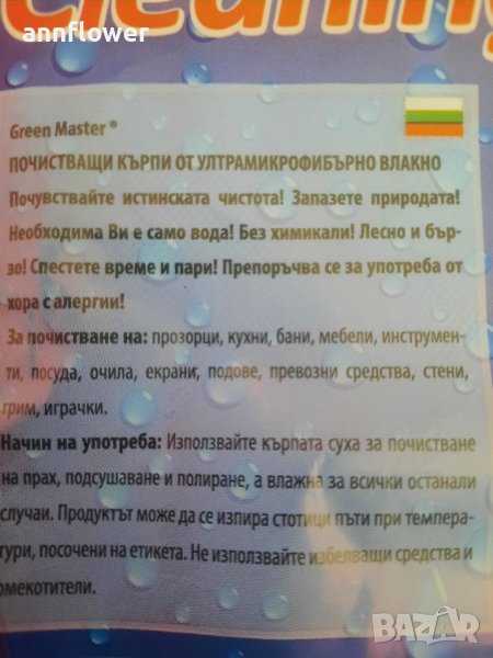 Как се използват кърпите? Когато кърпата е суха, прахта и замърсяванията се свързват на повърхността им чрез статично привличане. Затова може да се използва за почистване на прах, подсушаване и полиране. За почистване на петна от мазнини и всички останали случаи кърпата трябва да е влажна и замърсяванията се улавят, благодарение на капилярни сили на взаимодействие. Почистване и поддържане на кърпите Преди първата употреба се препоръчва да се изпере със сапун и да се изплакне, за да се измие техническия прах, останал в тъканта при производството. Кърпата се прегъва двукратно и по този начин получаваме 8 работни повърхности. Използвайте всяка една от тях, преди всяко изпиране. При почистване на грапави повърхности, внимавайте да не нарушите структурата на влакната. При изстискване не усуквайте кърпата прекалено. Може да се изпира стотици пъти при температури, посочени на етикета. Не използвайте избелващи средства и омекотители.