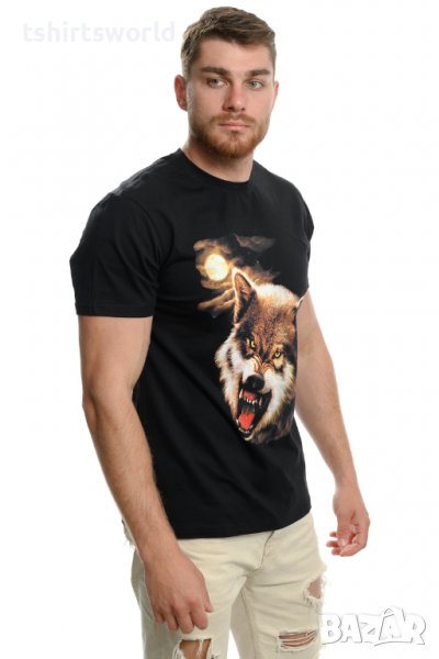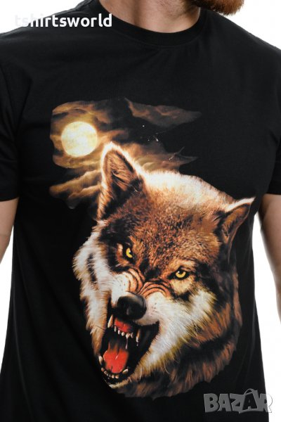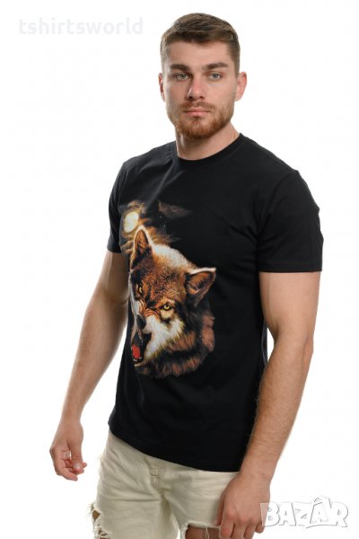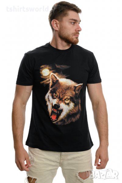 мъжка тениска с професионално изработен висококачествен дигитален печат Зъбат вълк, Пълнолуние - Луна, устойчив на пране с години. Тениската е изработена в България под марката PRINTEX от висококачествен 100% пениран памук на 170 гр./м², който запазва цялостта на материята и наситеността на цветовете на черното трико дълго време. Тениската може да се пере при температура до 40 градуса. Спокойно можем да гарантираме за качеството на изработката и ярките цветове на дизайна.