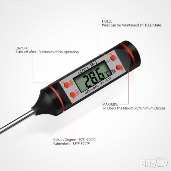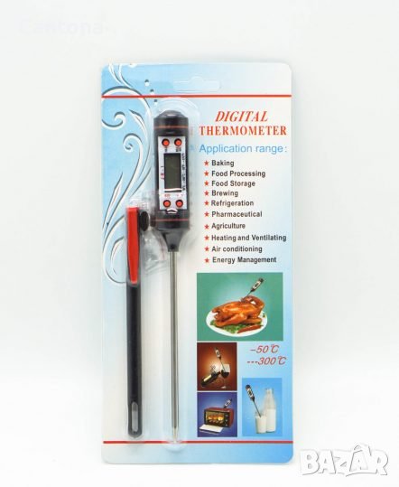 Висококачествен термометър с игла-сонда за хранителни продукти, ястия и течности с дигитален LCD дисплей. Благодарение на този термометър, може да проверите и да се уверите, че храната винаги е добре сварена и изпечена. Идеален инструмент, полезен при готвене за тестване отвътре или отвън, за проверка дали температурата в съответния хранителен продукт или течност е подходяща! Изключително лесен за употреба с възможност за показване на температурата във Фаренхайт и Целзий. Технически характеристики: