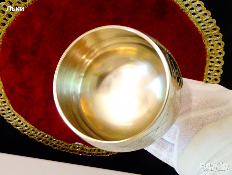 изработка от масивен високо качествен бронз.Маркиран от производителя E.P.N.S.Бокала е релефно гравиран с приказни орнаменти и флорални мотиви.Искри със златен блясък и звъни