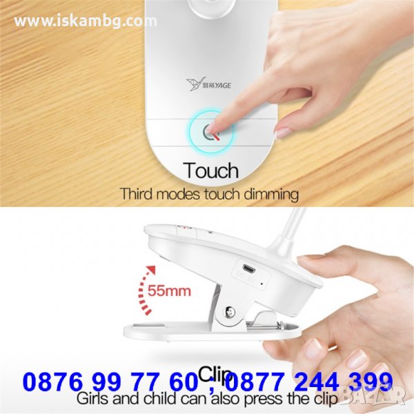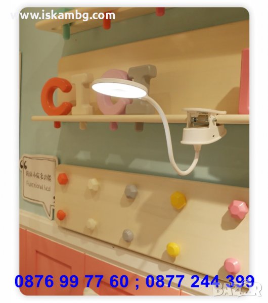 Лед мултифункционална лампа, нощна лампа, LED лампа за четене с щипка и тъч бутон с 3 степени на яркост и огъваема стойка. С тъч бутон за включване и изключване, удобната щипка позволява да я закачате на различни места, огъваемата стойка позволява да я насочите към обекта който желаете, а зарядната батерия премахва необходимостта от електрически кабел. Зареждате с USB кабел, който е включен в комплекта. Мощност 2 W