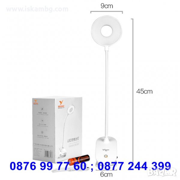 Комплекта съдържа: Лампа с гъвкава стойка и щипка, зарядна батерия 1 бр, USB кабел 1бр .
