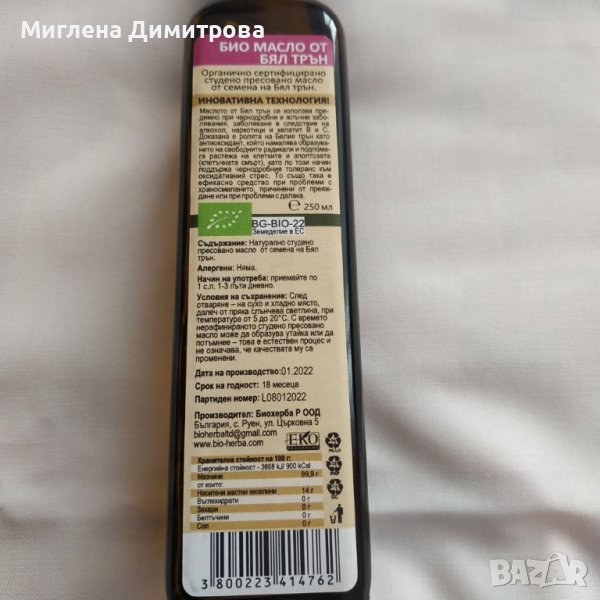 Условия на съхранение: След отваряне - на сухо и хладно място, далеч от пряка слънчева светлина, при температура от 5 до 20°C. С времето нерафинираното студено пресовано масло може да образува утайка или да потъмнее - това е естествен процес и не означава, че качествата му са променени.