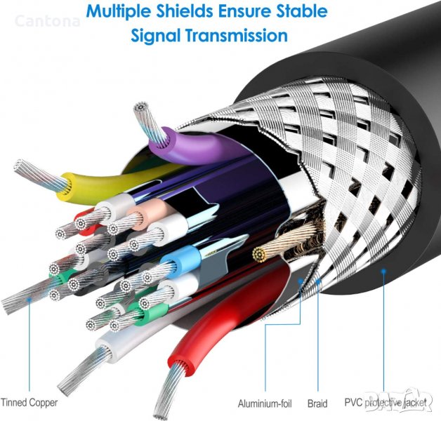 - Позлатените съединители са устойчиви на корозия и подобряват предаването на сигнала. Екранирането от плетено фолио намалява смущенията, а оголените медни проводници подобряват предаването.