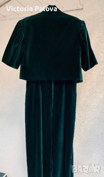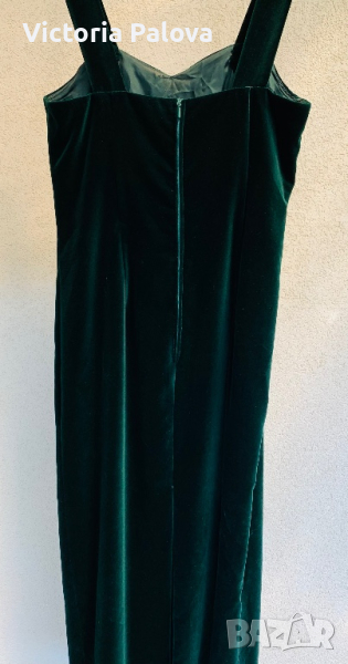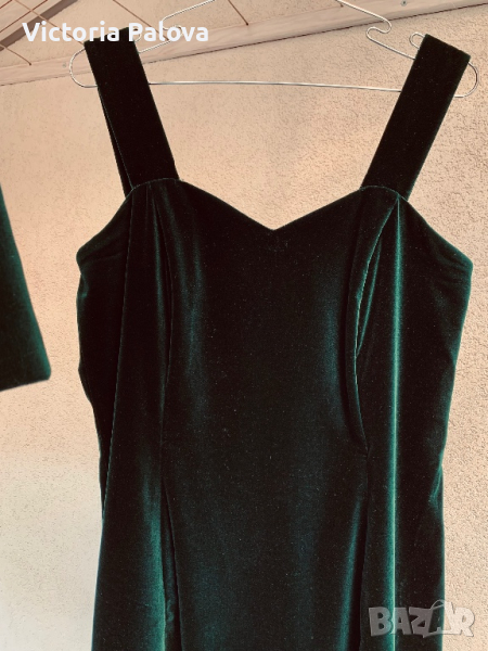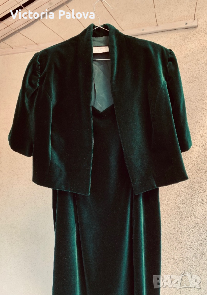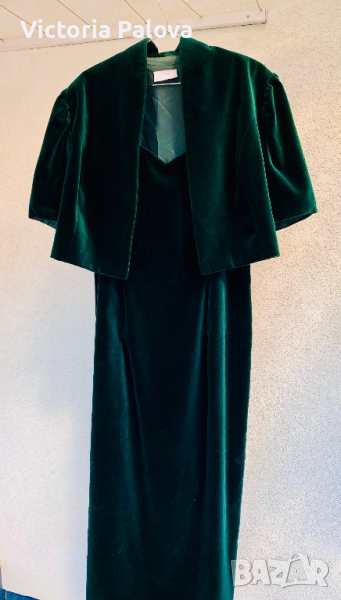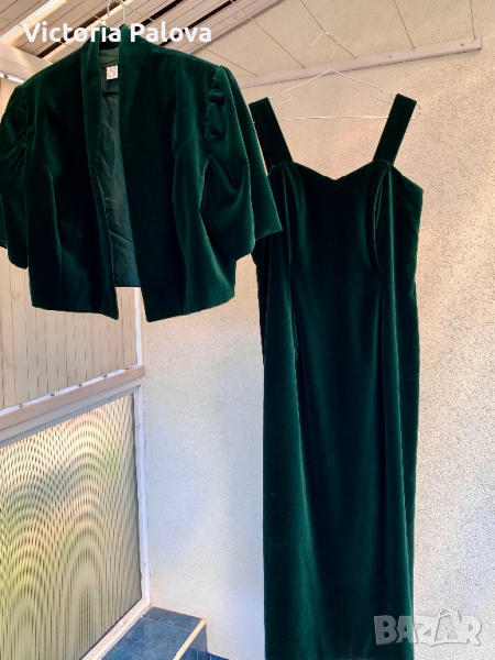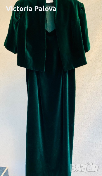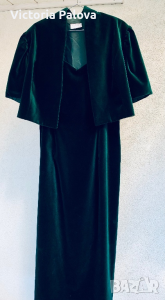 Нещо невероятно красиво и ефектно-немска дизайнерка,изработва специални рокли и тоалети за сватби и вечерни мероприятия.роклята е дълга 130см с презрамка,от мишница-109см.презрамката е широка 4,5см-много удобно и невероятно красиво.ГО-46см,талия-45см,ханш-55см,цепка отзад е 43см.роклята стои невероятно,по корсета има надлъжни банели.Болерото е с леки подплънки,дължина-48см,ГО-52-53см,рамене-42-44см.към този невероятен тоалет има обувки същия цвят в моите обяви.