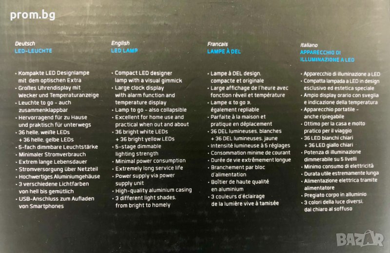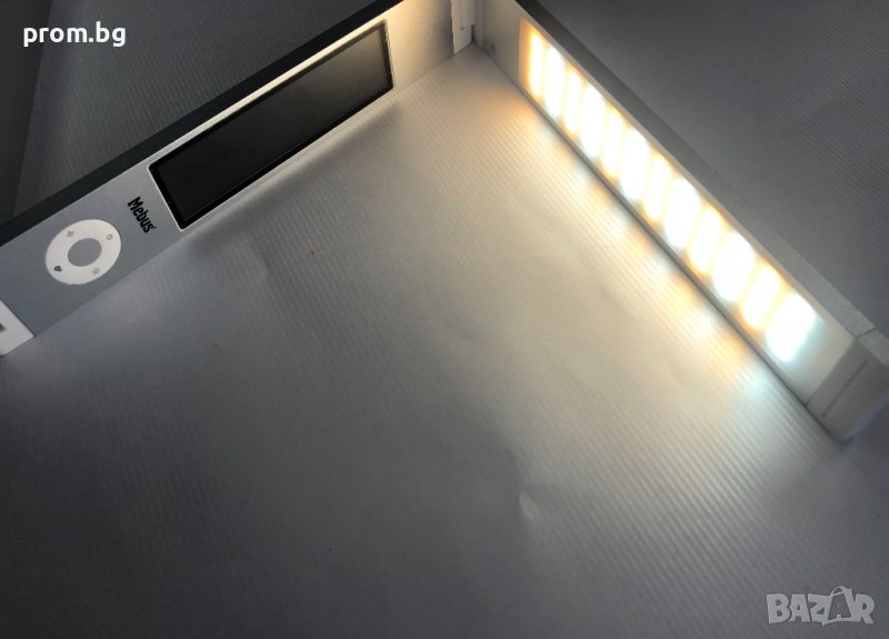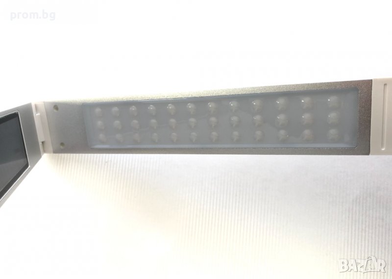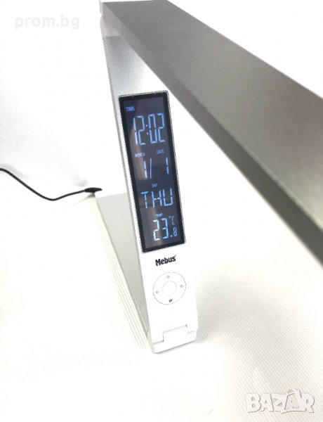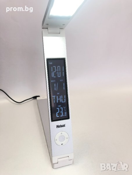 LED сгъваема лампа с термометър, часовник и календар, MEBUS, Германия. Клас на енергийна ефективност от A до A ++, поради вградени LED лампи. LED дизайнерска лампа с 36 светли, бели/жълти светодиода. Промяна на яркостта на светене на 5 степени. Радио управляем часовник с календар, аларма, часовник. Лампата е сгъваема, може да се променя ъгълът на светене, чрез въртене на 180 градуса. Лампата има USB порт. Материал: алуминий. Лампата е с 3 различни нюанса на светлина и с висококачествен алуминиев корпус. Входящо напрежение 12 V/DC, 1.5 A.