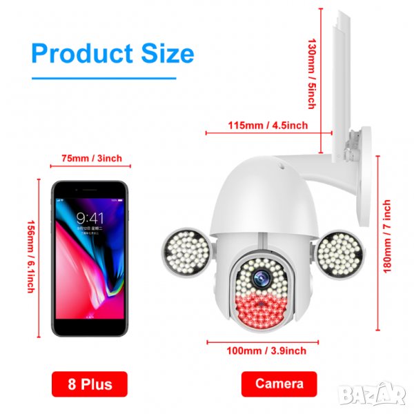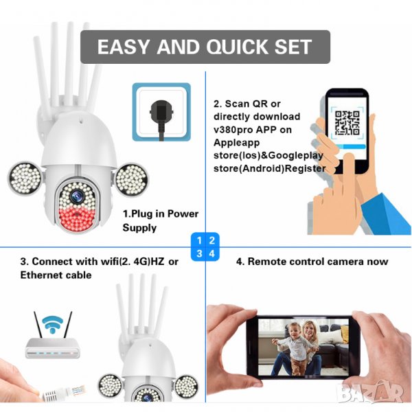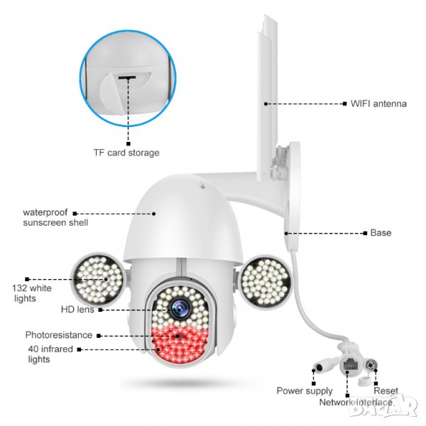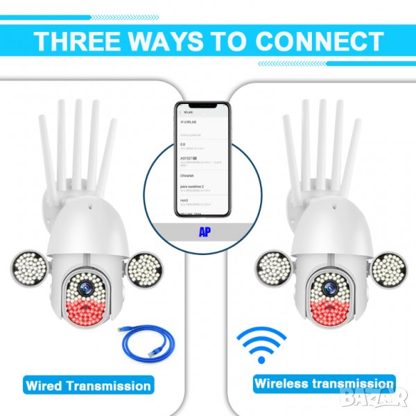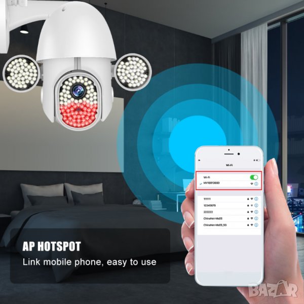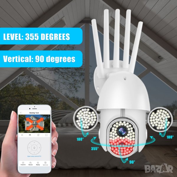 Wifi, Въртене, Full HD, Нощно виждане висок клас с много светодиоди, Микрофон, говорител, водоустойчива, с 5 антени.