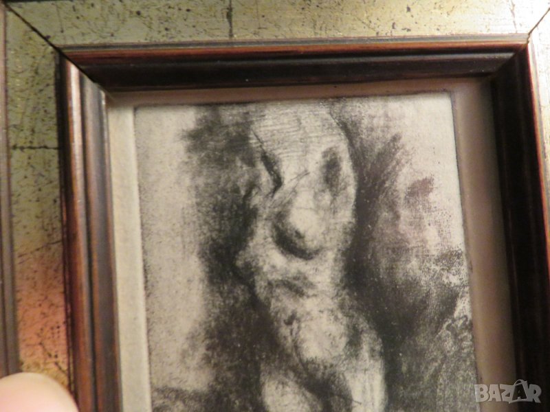 Графиката е във дървена рамка и стъкло.