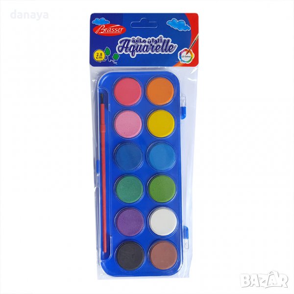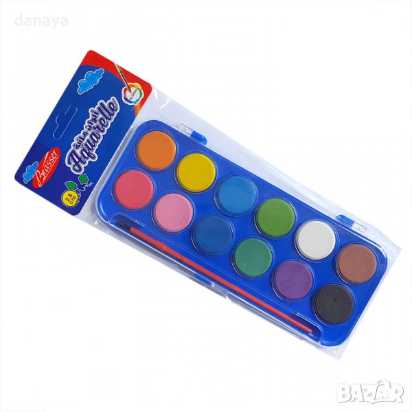 Водни боички за рисуване 12 цвята. Устойчиви, наситени цветове, в пвц кутия. Боичките се предлагат с четка за рисуване. Подходящи за училище, детска градина и домашно ползване.