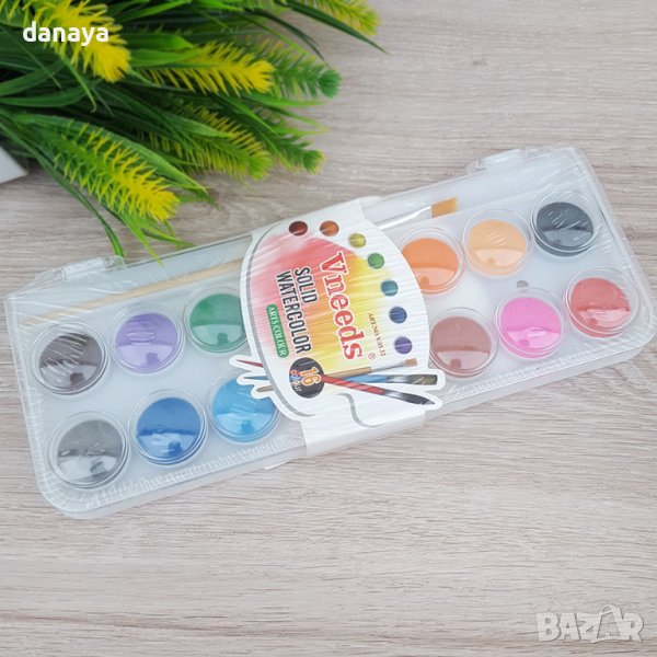 Водни боички за рисуване 16 цвята. Устойчиви, наситени цветове, в пвц кутия. Боичките се предлагат с четка за рисуване. Подходящи за училище, детска градина и домашно ползване.