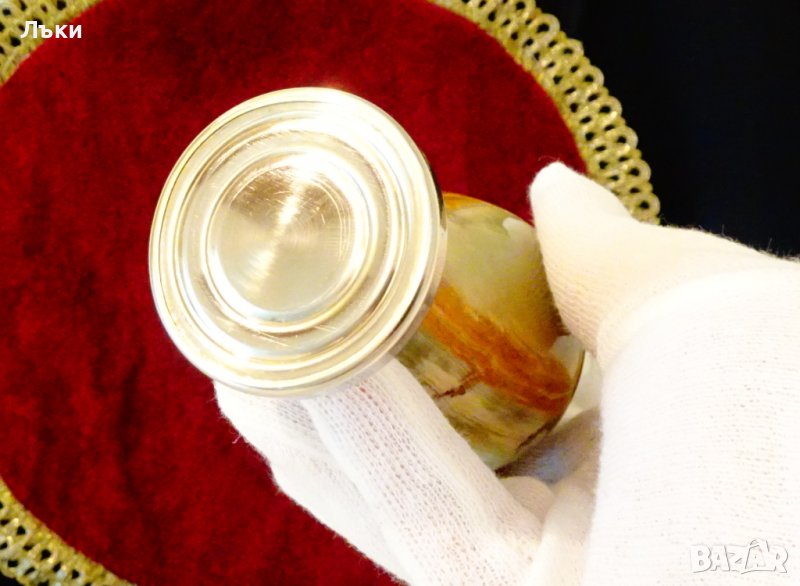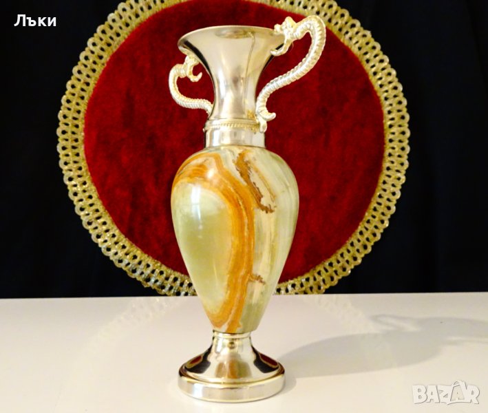 посребрен месинг и нефритено зелен оникс с красиви нюанси.Има две бронзови дръжки,релефни фигури на дракон.Височина 15 см.,дължина 10.5 см.,диаметър 6