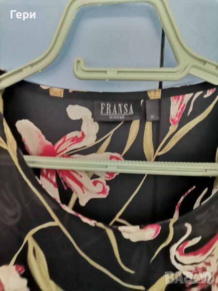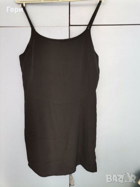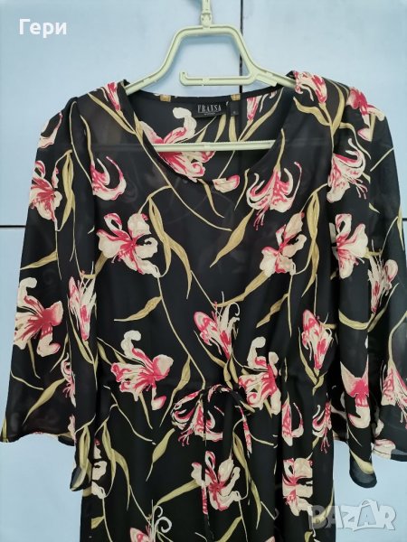 Рокля в две частни - черна рокля, която може да се носи като подплата, и горна част от шифон. Ефирна приятна материя, стяга се в кръста. Дължина на горната част - 115 см, рамене - 38 см, подмишници - 48 см, подплата - подмишници - 48 см, ханш - 46 см, дължина - 90 см.