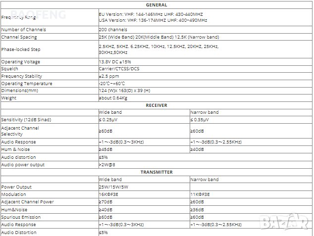 Отделна настройка за всеки отделен канал: широк 25KHz, среден 20KHz, тесен 12,5KHz.