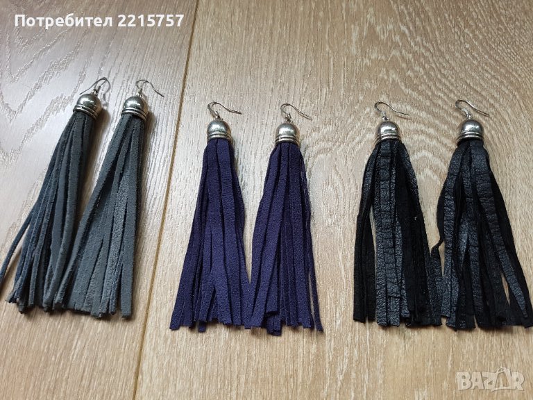 1)К-т от естествен велур, цвят теракота: медальон+обеци 10см+синджир от стомана(не потъмнява). Цена 24лв..................................................................................................................2)К-т от естест.велур, в сиво : медальон+обеци 13см+синджир от стомана. Цена 28лв..................................................................................................................3)Обеци цвят сиви-11,5см(15лв), черни-10,5см(12лв.), сини-10,5см(10лв.)
