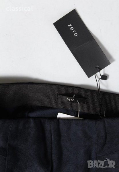 Нов дамски еластичен панталон на немската марка Zero . Цветът е синьо-черен. В предната част на панталона материята е като велур. По етикет размерът е EU 40 . Талия 84 см , външна дължина на крачола 94 см. Състав: 90% полиестер, 10% еластан.