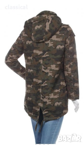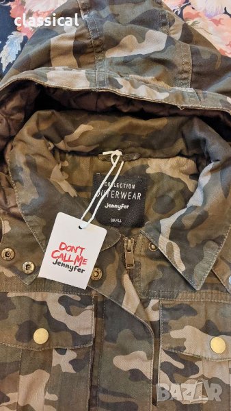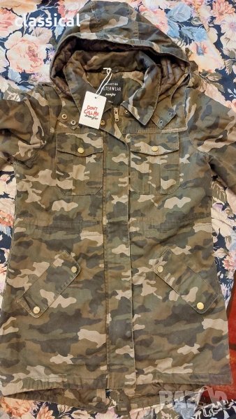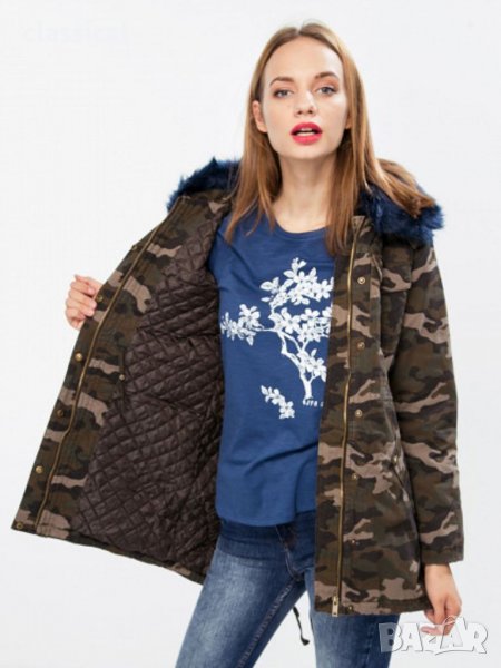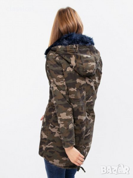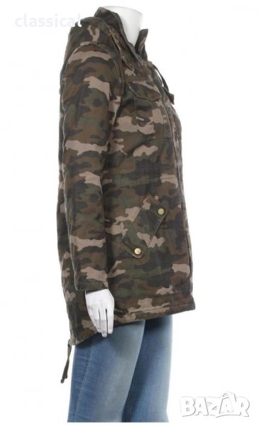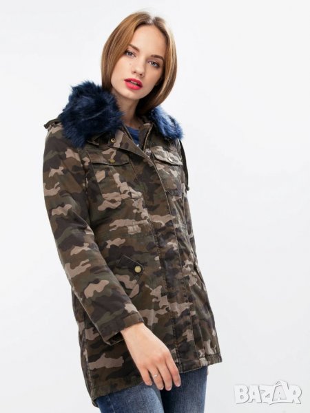Ново дамско яке / парка Jennyfer. Десен камуфлаж. С шушлекова дебела подплата , подходящо за зимата. Размер S . На снимките с модела от интернет, якето има на качулката топла подплата от изкуствен косъм в синьо. Но якето,което продавам е без този елемент.