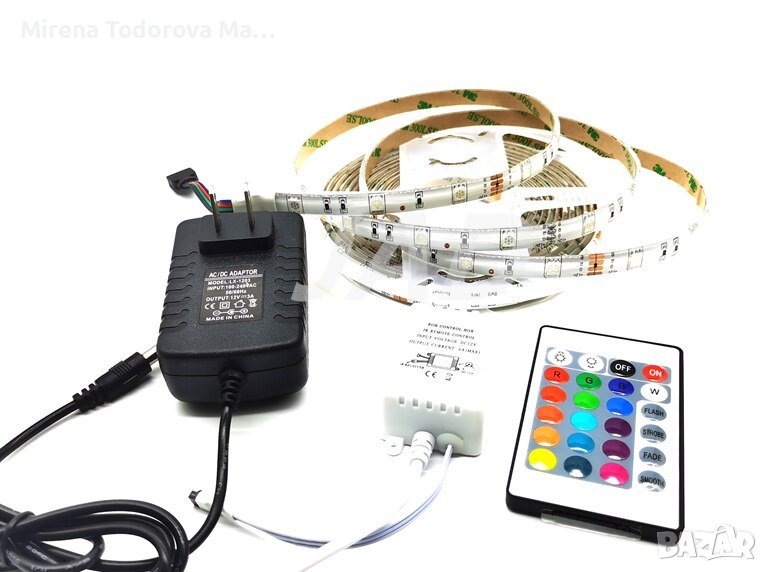 Спецификация: Модел на продукта: RGBW комплект светлинна лента Размер на продукта: 1000*10*3 мм Обхват на облъчване: 3-5м Използвайте сцена: дом, хотел и бар Модел мъниста за лампа: 5050RGB Мощност на продукта: 7 W/m Цветна температура: RGB преобразуване на дистанционно управление Аксесоари: 1 * светеща лента 1 * Дистанционно управление (Без батерия) 1 * Захранващ адаптер