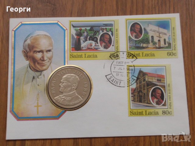 - рядък плик с монета и марки Санта Лучия / Сейнт Лусия / St Lucia, монетата е 5 долара 1986 - посещение на папа Йоан Павел II - 119 лв.