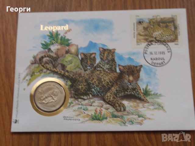 - рядък плик с юбилейна монета и марка, монетата е Афганистан 50 афгана 1987 - Защита на природата (Леопард) - 49 лв.