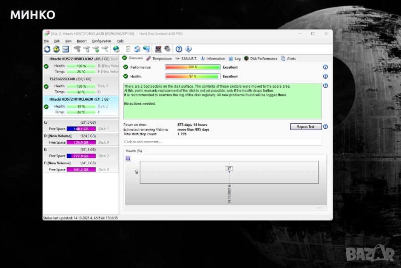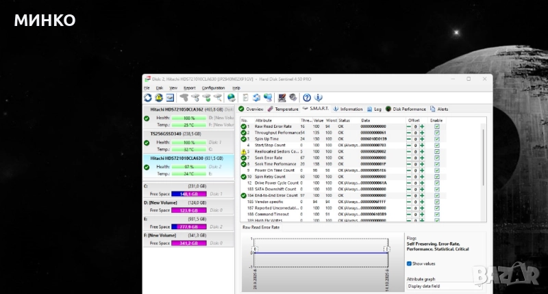 HITACHI 1TB 2 бад сектора-15лв