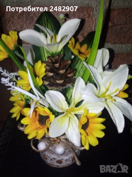 Красива декорация - ръчна бутикова изработка. Подходяща, както за украса на Вашия дом, офис или вила, така и за подарък. Височина - около 20 см, ширина в долната част - около 6 см. Използвани са естествени природни материали, изкуствени цветя, канап, дантела, мъниста силикон и др.