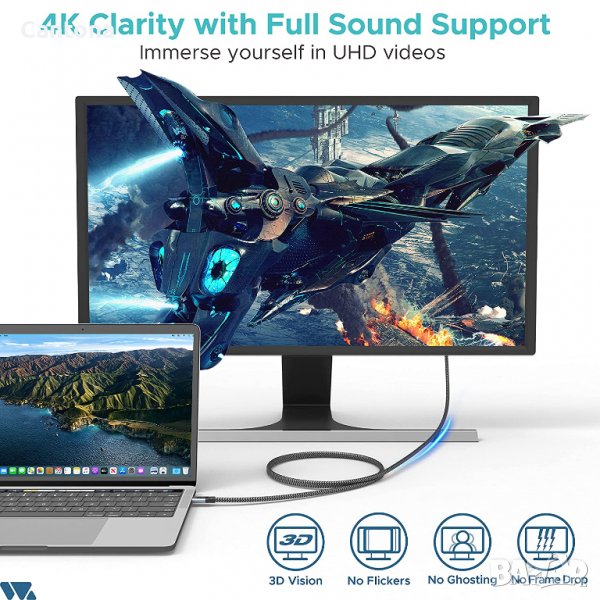 WARRKY USB C към HDMI кабел 4K, Thunderbolt 3 към HDMI адаптер, 2 метра