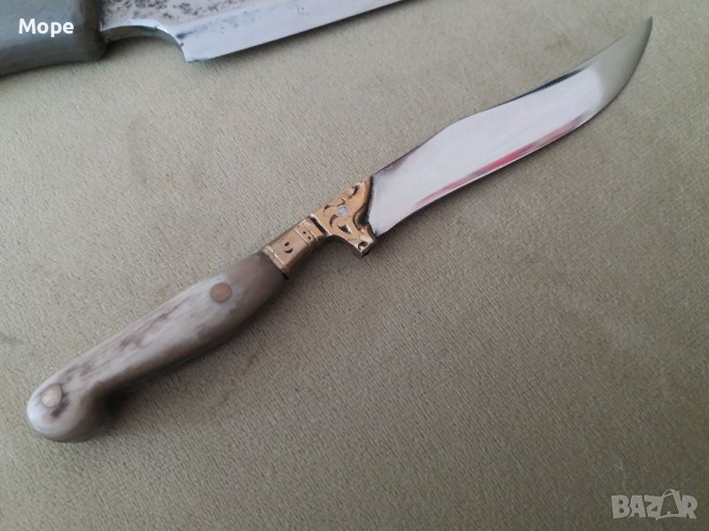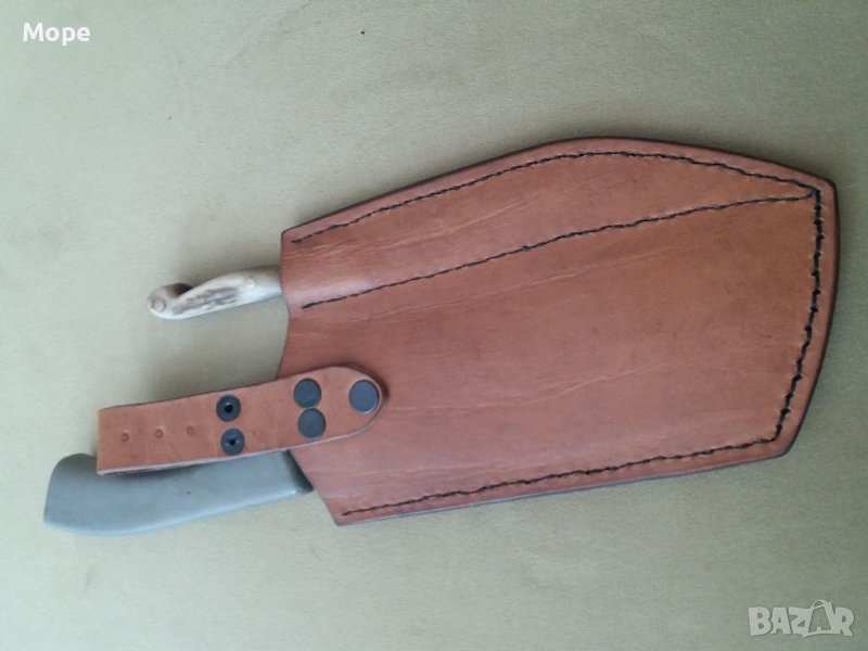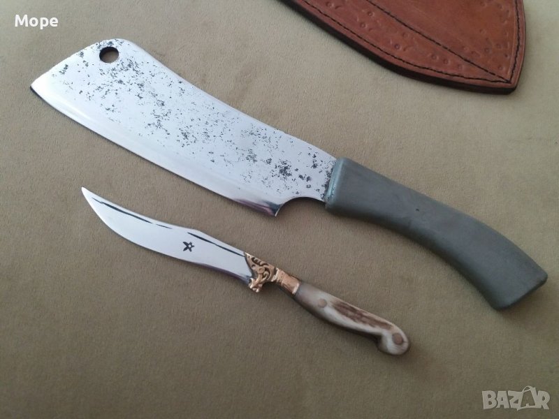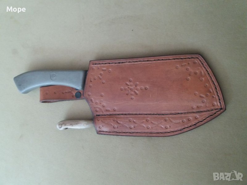 Сатър и нож в една кания. Стоманата е много добра както и изработката. За лов и риболов. Сатъра е руски. Ножа е с дръжка от рог и месинг. Канията е от естествена кожа.