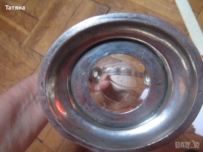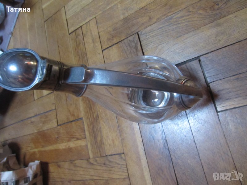 Стъклената кана е много стара;обкова е ръчно инкрустиран;