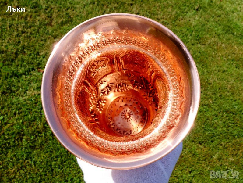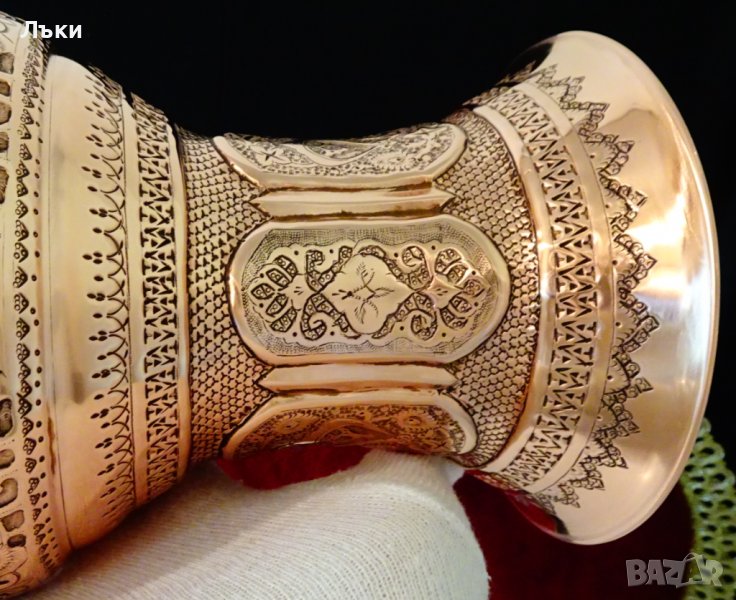 гравира със специално предназначени инструменти,които надхвърлят 120 вида.Да опиша с думи красота,която оставя без дъх щом я погледна е твърде трудна задача – безброй орнаменти,образи,релеф,вазата сякаш е безкрайна.Медта е толкова блестяща,червена,че заслепява с червени искри.Наложи се да снимам без светлина за да се види тази дантела от орнаменти и пак не мога да покажа и не мога да опиша зашеметяващия ефект „на живо”.Гледам,гледам и не мога да се нагледам…!Височина 20 см.,диаметър 14 см.,тегло 750 гр.