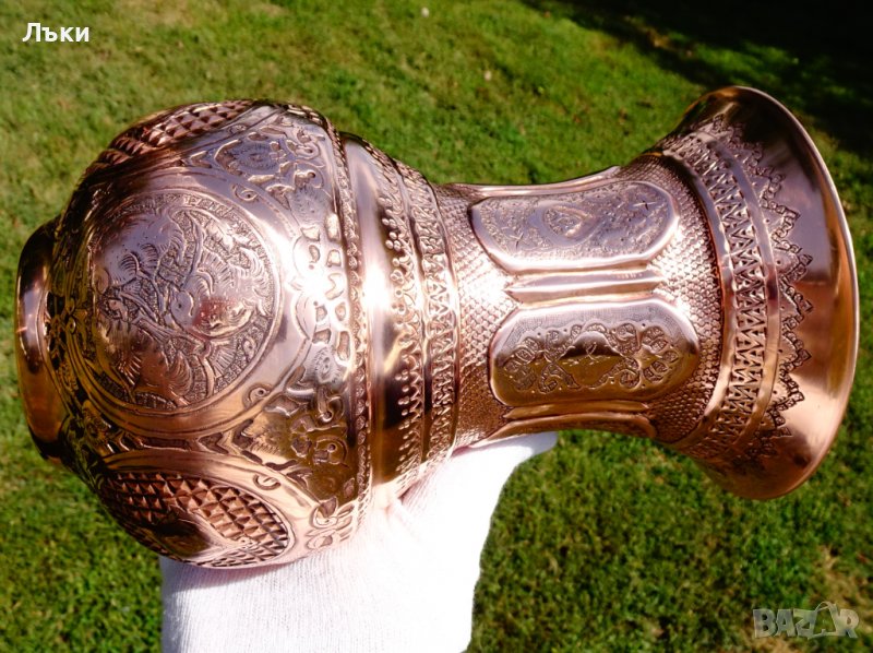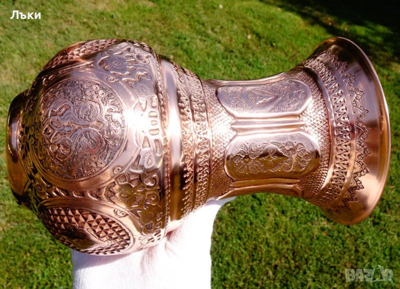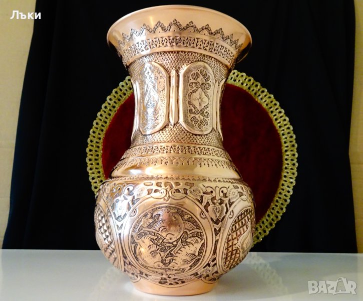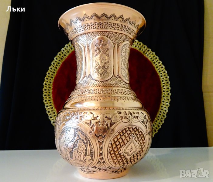 Старинна ръчно кована персийска медна ваза,съвършен представител на древното изкуство възникнало преди 3000 години в столицата на Персия Isfahan,наречено Qalamzani или Ghalam zani.Каламзани представлява прехвърляне на изображения върху метална повърхност.Кове се и се