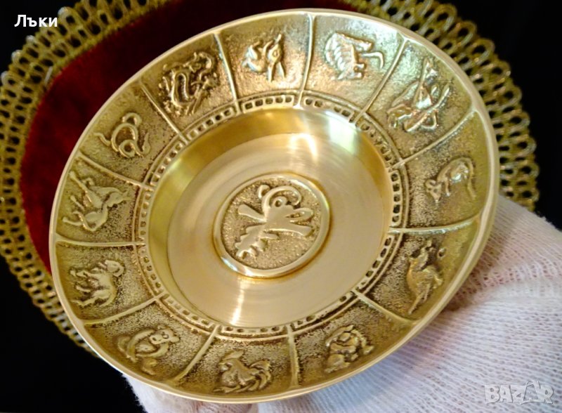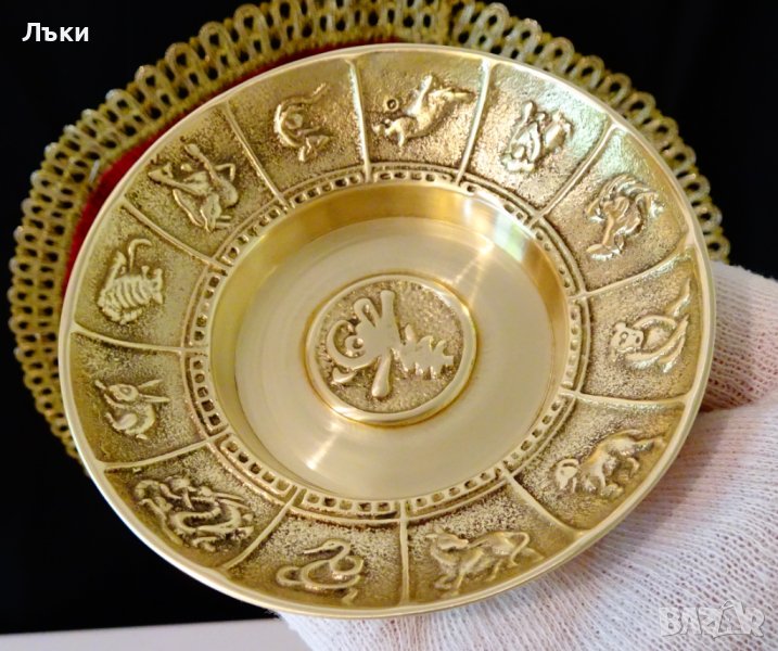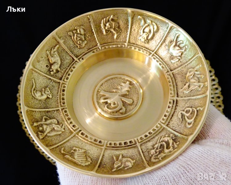 изработка с релефно изображение на китайския годишен календар,зодиак,фън-шуй.В центъра на съда има китайски знак.Височина 2.5 см.,диаметър 10 см.,тегло 115 гр.