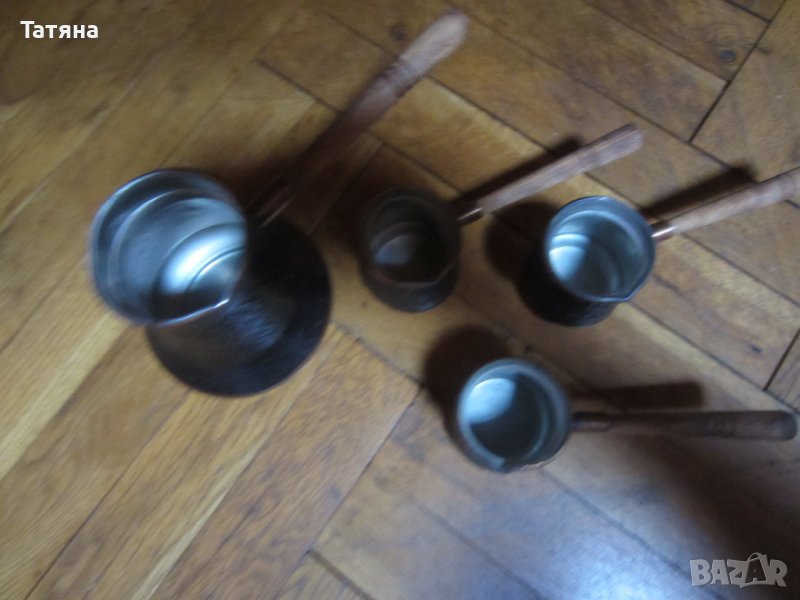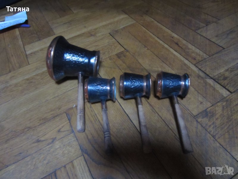 Снимка 4-8 КОМПЛЕКТ МЕДНИ ДЖЕЗВЕТА ;високо 11см;дъно-11см/голямото;малките -високи -6см;дъно -5,5см;дървени дръжки.Цена -60 €