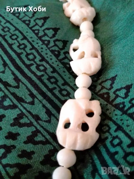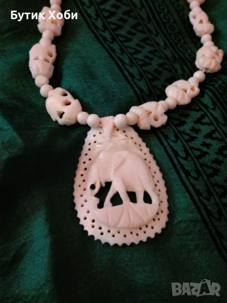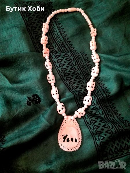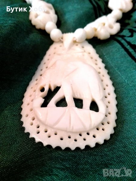 Оригинално колие от слонова кост. Ръчно резбовани елементи. Дължина - 46см; медальон - 5 х 3,5см; елемент на колието - 1,5 х 1см.