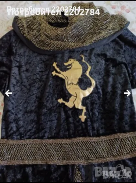 Черния костюм е имитация на царско, рицарско облекло.Златното ламе,изплетено като мрежа имитира ризница.Черен плюш с изправен златен лъв на гърдите.