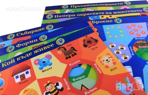 Забавна образователна магнитна игра. С помощта на шестте двустранни карти тип „въпрос / отговор“ и умното куче (вълшебен учител) детето открива отговорите на интересни въпроси от света на човека и животните, учи се да разпознава цветовете, развива логическото мислене и двигателните си умения. Комплектът съдържа следните карти – кой къде живее; кое от какво се прави; цветове; форми; часовник; намери окраската на животното; противоположности; разстеж и развитие; кой използва тези превозни средства; събиране; броене; човешкото тяло. Размери кутия – 41х28х5 см. Тегло за комплект – 650 г. Материал – картон, PVC, метал. Подходяща за деца над 3 години